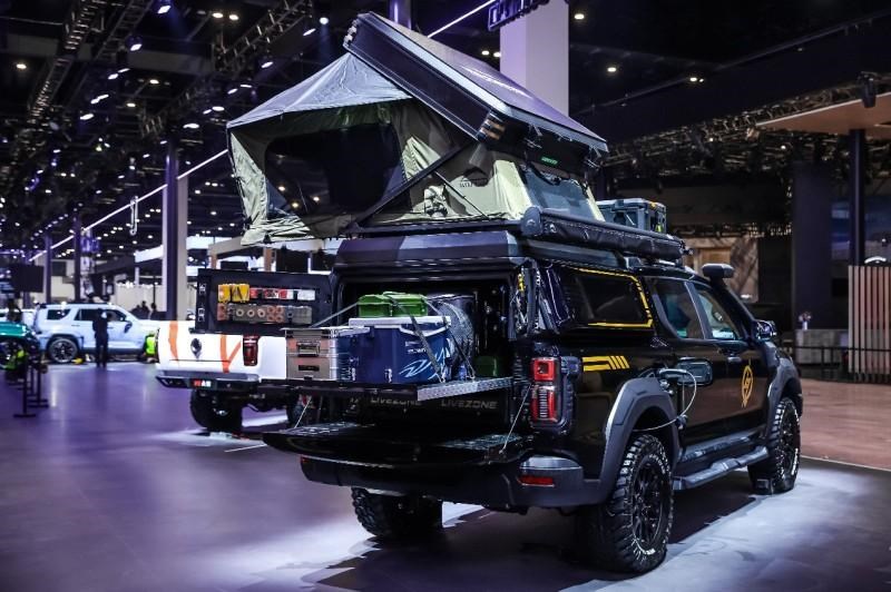 在众多展车中,山海炮Hi4-T钓鱼共创版是深度场景化定制改装标杆。车型由长城炮联合览众房车与“中国钓王”天元邓刚深度共创,定制改装套件同时适配山海炮Hi4-T皮卡及旅居车型,一站式覆盖钓鱼玩家出行、装载、户外用电及露营休憩等全维需求。